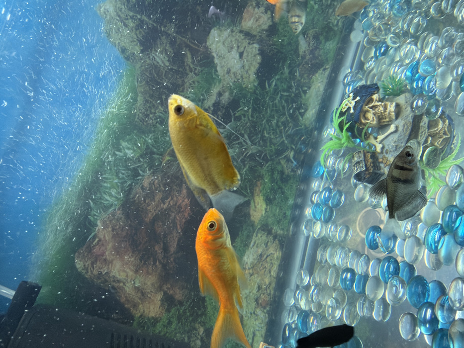 The image displays an aquatic environment, specifically an aquarium, situated in a domestic or private setting within Glendale, United States of America. The scene is dominated by multiple species of fish and artificial decorations. In the foreground and midground, three primary fish are visible. On the far left, an orange goldfish (Carassius auratus) is oriented horizontally, facing right. Adjacent and slightly behind it, a larger, pale yellow or gold-colored fish, identified as a gourami (likely a Gold Gourami, Trichogaster trichopterus), is also oriented right, displaying prominent filamentous pelvic fins. At the bottom center, a smaller, silver-bodied fish with vertical black stripes, consistent with a Black Skirt Tetra (Gymnocorymbus ternetzi), swims above the substrate, facing right. A dark, possibly black, fish is partially visible on the far left edge of the frame, mostly obscured. Several other smaller, iridescent fish are partially visible in the bottom right background. The aquarium's substrate consists of a layer of polished glass beads or marbles, predominantly clear and translucent blue. Among these, artificial aquarium decorations are arranged. These include a small, brown treasure chest model with an open lid and, to its right, a cream-colored skull model wearing a black pirate hat adorned with a white skull and crossbones emblem. Green plastic aquatic plants are interspersed around these decorations. The background of the aquarium features a printed or adhered backdrop depicting a rocky, overgrown underwater landscape with green foliage against a vibrant blue upper section, simulating open water or sky. Numerous fine white particulate matter, likely detritus or air bubbles, are suspended throughout the water column. A black filter or heater component is visible in the upper left corner of the tank. The lighting appears even and bright, illuminating the contents of the tank.