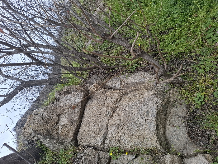 The scene depicts a natural rock formation and vegetation, situated in a rocky or hillside area within Plovdiv, Bulgaria. A substantial, light-grey granite-like rock formation, exhibiting numerous visible fracture lines and weathered surfaces, dominates the left side of the frame. Adjacent to the rock, extending into the mid-ground, are several deciduous trees with bare, multi-branched canopies, displaying initial budding. The ground surface beneath the rocks and trees is densely covered with vibrant green ground vegetation, consisting of grasses and various small plants, intermingled with scattered small yellow flowers. A rocky, vegetated elevation is discernible in the upper-left background. The sky is uniformly overcast. No human subjects, animals, or man-made structures are present within the depicted environment.