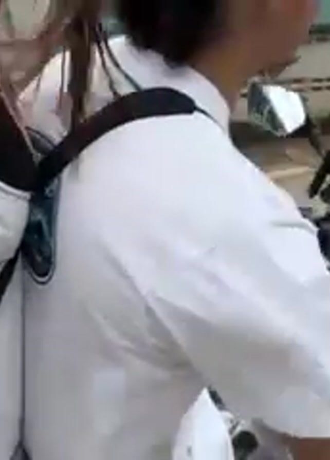 Two individuals, one driving a black scooter, are visible. The driver, wearing a white shirt and bandana, is adjusting the controls. A passenger, wearing a white top and black straps, sits behind. The background includes a building and overcast skies.