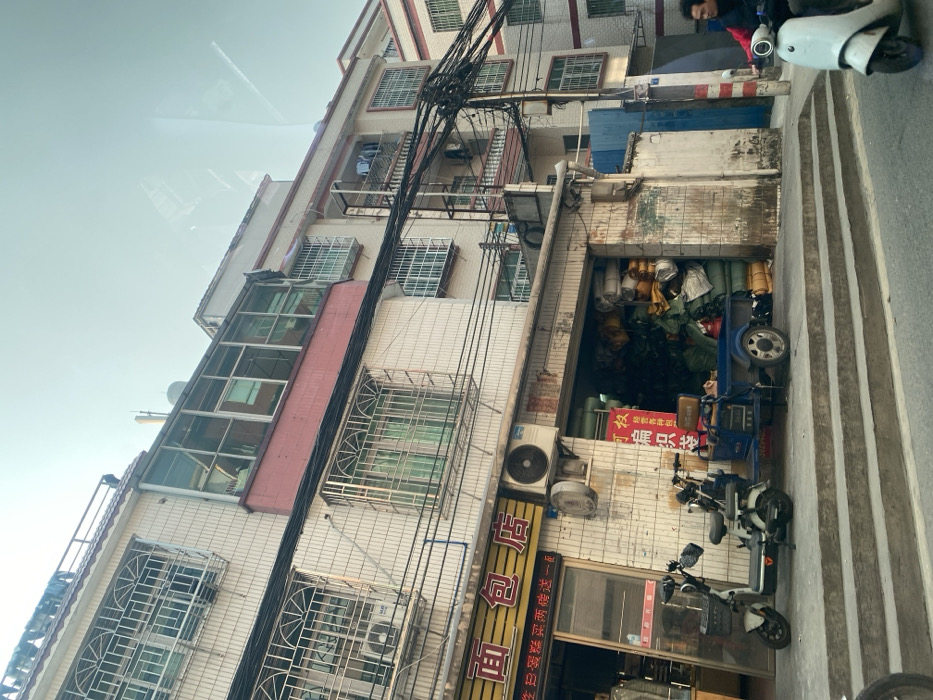 An aging urban building displays a mix of architectural styles. Its façade, dotted with barred windows and an enclosed sunroom, is traversed by a tangle of electrical wires. The street-level commercial space is overflowing with goods, with a scooter parked outside. A vertical sign in Asian script flanks the shop's entrance, above which an air conditioning unit is mounted. The building sits adjacent to a concrete wall with steps.