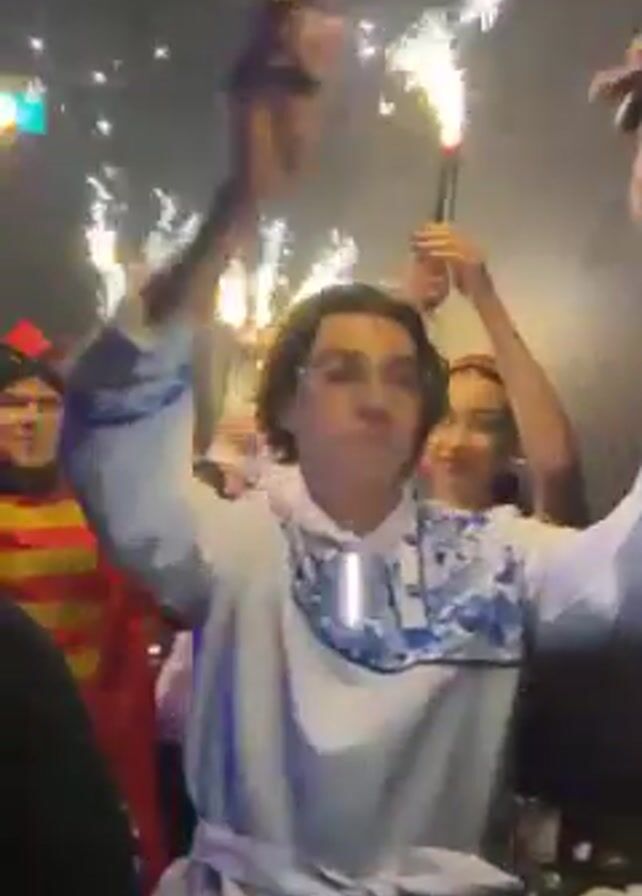 group of people celebrating indoors. Several people are holding sparklers that are actively emitting sparks. One individual is wearing a silver sequined dress and making a “rock on” hand gesture, smiling at the camera. Two other people are dressed in red and gold ornate costumes, with hats that appear to be Russian-inspired. They are holding sparklers high and shouting. The background is dark, with some light reflecting off the sequins and sparklers. A green exit sign is partially visible. There is a general atmosphere of excitement and celebration.
