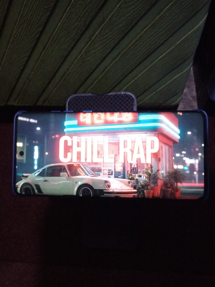 A smartphone displays an image of a white Porsche parked near a neon-lit building with Korean writing. The words "CHILL RAP" are superimposed in bright neon letters. The phone is propped up by a small, black, mesh-like stand. The phone rests on a dark surface, possibly fabric. Above the phone, a green, textured surface is visible, potentially a cushion or part of a piece of furniture.