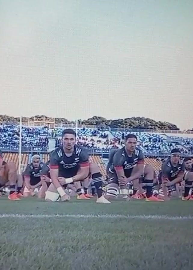 A group of rugby players, dressed in black and gray uniforms with "AIG" logos, are performing a Haka on a green field