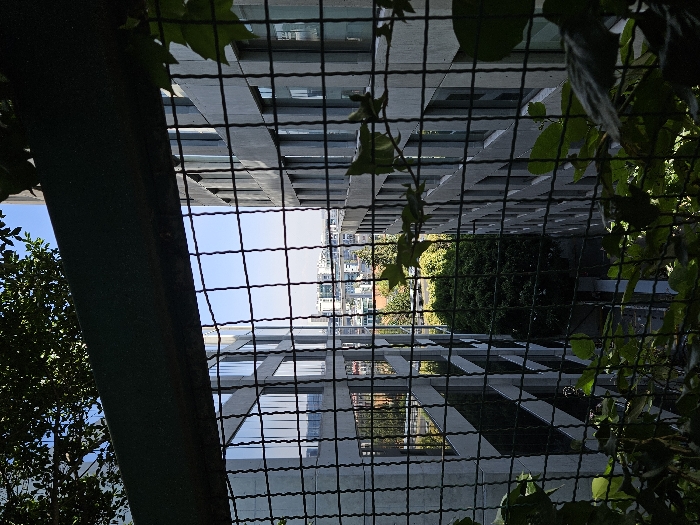 A warped perspective peers through a wire fence, framing a modern building with a grid-like facade. Sky is visible between the building's structural elements. Lush green vegetation encroaches on the sides of the frame, partially obscuring the architectural view. The camera angle is unusual, presenting the scene in a disorienting, tilted manner.