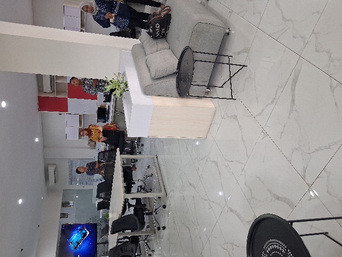 A brightly lit office features white marble flooring. A gray couch sits near a white and light-colored wood reception desk. Several people occupy the space. Two black side tables are placed around the couch. Desks and chairs are positioned in the background, with a large screen on the wall displaying an image. The layout suggests a modern and functional workspace.