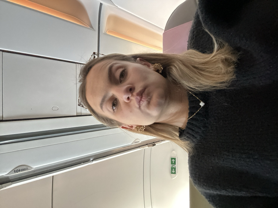 A woman takes a selfie inside an airplane. She is wearing a black sweater, gold floral earrings, and a delicate gold necklace with a white pendant. Her blonde hair is loosely styled. She is making a kissy face. The interior of the airplane is visible, with overhead compartments and an emergency exit sign. The lighting is bright and even.