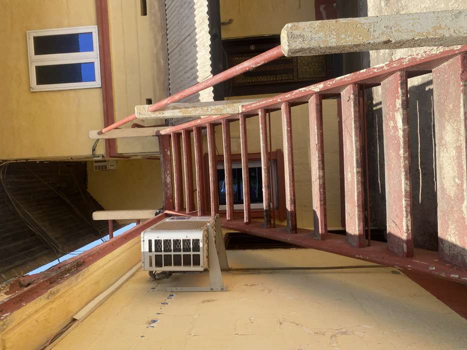 The scene, located in Tudun Nupawa, Nigeria, depicts an outdoor residential or commercial building facade under bright daylight. A prominent, weathered, rust-red painted metal staircase with concrete newel posts and metal handrails ascends centrally towards the upper right. The staircase exhibits significant paint peeling and surface degradation. To the left of the staircase, a light yellow-painted wall, showing cracking and peeling paint, features a white outdoor air conditioning condenser unit mounted on a metal bracket at mid-height. Below the unit, a dark rectangular opening, possibly a doorway or recessed area, is visible. Above the staircase, the upper section of the building also presents a faded yellow facade, adorned with a white-framed, two-pane window containing dark blue tinted glass. To the right of the staircase, partially visible beneath an overhang, is a section of a lower building with a grey corrugated metal roof. A dark entryway with a discernible patterned metal grate is situated beneath this roof structure. Above the upper left portion of the staircase, exposed wooden joists or the underside of a roof structure are visible. The ground surface at the base of the staircase is a light-colored, possibly concrete, patio area. No individuals or active events are present in the image. Shadows cast by the staircase elements indicate strong direct sunlight.
