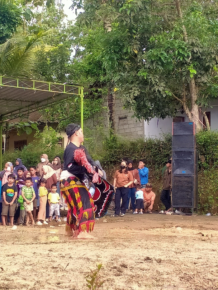 An outdoor scene in Ganten, Indonesia, depicts a cultural performance. In the mid-ground, a male performer stands in profile, facing right, with bare feet on dry, light brown soil. He wears a black long-sleeved shirt, a black head covering, and an elaborate, multi-colored traditional lower garment featuring red, yellow, and black patterns. His right arm is adorned with prominent red, feather-like material. Behind him, to the left, a group of approximately 15-20 onlookers, including adults and children, observe the performance. They are casually dressed; some adult females wear hijabs. To the performer's right, a stack of four black rectangular sound speakers stands vertically on a metal frame. The background consists of dense green foliage and trees, partially obscuring a concrete block building. On the far left, a green metal framework, possibly a temporary canopy structure, is visible. The scene is illuminated by natural daylight.