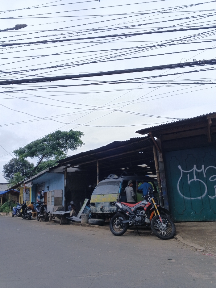 This image depicts a street scene in Bhimad, Nepal, under an overcast sky densely populated with numerous black electrical wires. A paved road occupies the lower foreground. On the right, a black and red dirt bike with gold front suspension is parked on its kickstand beside a dark green corrugated metal gate or wall marked with white graffiti. Adjacent to the left, an open-fronted workshop, covered by a corrugated metal roof supported by wooden posts, contains a partially disassembled light blue and yellow van. Two individuals are visible near the van, one wearing a light grey shirt, the other a blue shirt. Further left, a light blue building with a corrugated roof stands next to the road, with multiple motorcycles or scooters parked in front. Several individuals are seated or standing along this section of the street near the parked vehicles. Green foliage from trees is visible behind the buildings on the left side of the frame.