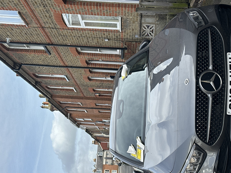 A dark grey Mercedes-Benz A-Class sedan is parked on a residential street in Guildford, United Kingdom