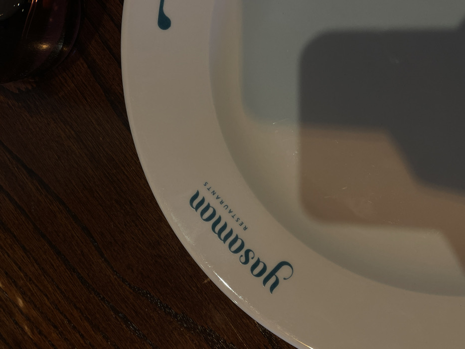 The image depicts a white ceramic dining plate positioned on a dark brown wooden surface exhibiting visible grain. The plate's upper left quadrant features a teal logo reading "yasaman" in a stylized cursive font, with "RESTAURANTS" in smaller, capital letters below it. A small, teal, teardrop-shaped design element is present near the top right rim of the plate. The top right corner of the frame reveals a fragment of a dark-colored, cylindrical object, consistent with a bottle or glass. A pronounced, rectangular shadow is cast across the lower half of the plate, partially obscuring its surface. No individuals are visible. This scene is situated within a restaurant environment in the city of Tsamakaberd, Armenia.