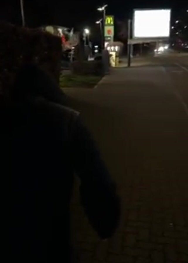 At night, an individual wearing a black jacket and blue jeans hurries along a brick sidewalk. The person is seen from behind, walking away from the camera. In the background, there's a McDonald's restaurant with its recognizable logo and a large illuminated billboard displaying an advertisement. Streetlights illuminate the scene, and there's a vehicle traffic passing on the road. The person's destination isn't clear. A voice can be heard saying, "Go, go, go, go, go, go. It's your train, brother. You can catch it, catch it, catch it, catch it, catch it, bro."
