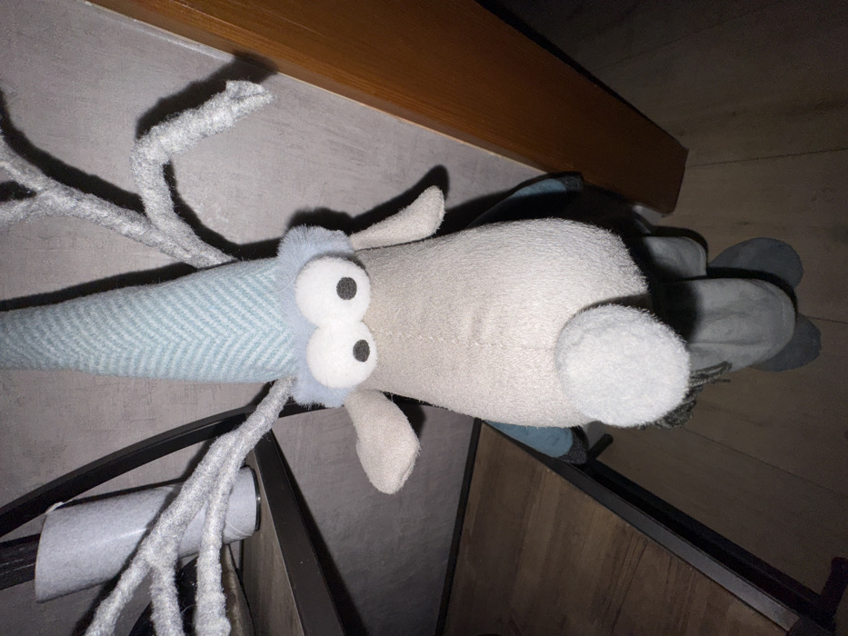 A stuffed animal rests at an oblique angle. Its head is light blue with a textured herringbone pattern and large, round white eyes with black pupils. Several grey, stringy appendages extend from its head. Its body is a solid light grey, and it has floppy ears of the same color. Its rear end has similar grey fabric with a blue accent. The animal is positioned on what appears to be a black metal rack with cylindrical objects attached. The background consists of a wooden surface and an off-white wall.