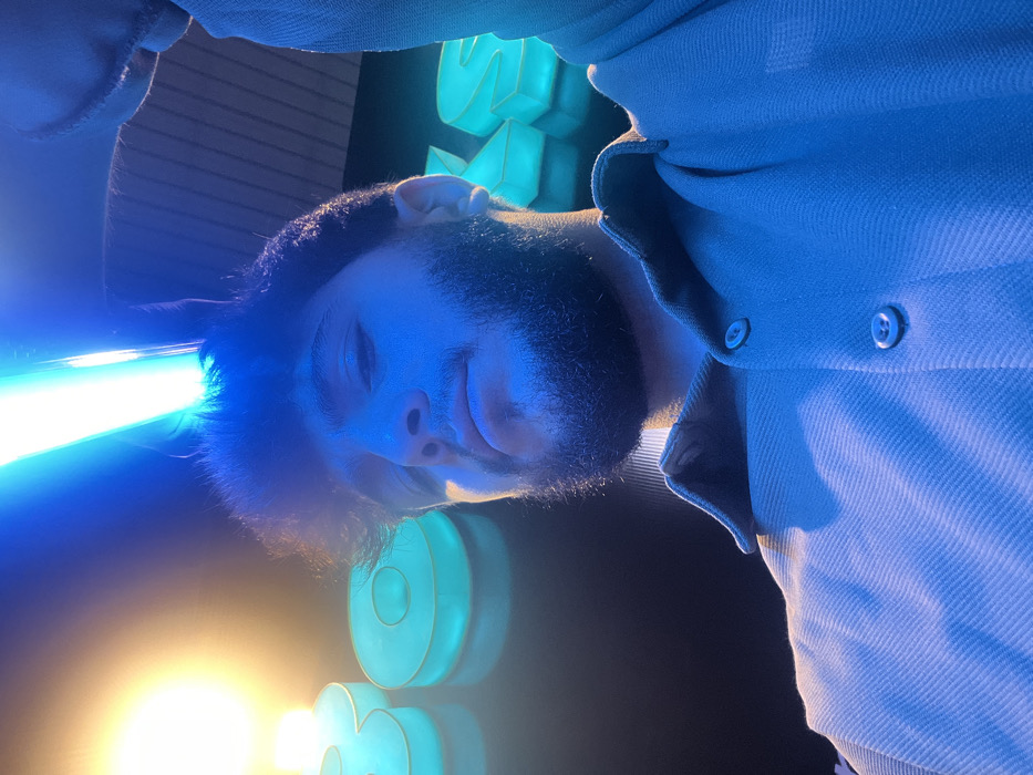 The image captures a low-angle portrait of a male individual, appearing to be an adult, with dark hair and a beard, looking directly towards the camera. He is wearing a light-colored, button-down collared shirt. The scene is predominantly illuminated by artificial light sources. A strong blue light, originating from an overhead fixture, casts a distinct blue hue across the subject's hair, face, and shirt. In the upper left background, a bright yellow circular light source is visible, alongside large, translucent, cyan-illuminated elements that resemble parts of numbers or letters, specifically a partial '3' or 'S' and a '0' or 'O'. The background suggests an indoor environment featuring prominent lighted signage. This scene is located in Shab'a, Syria.