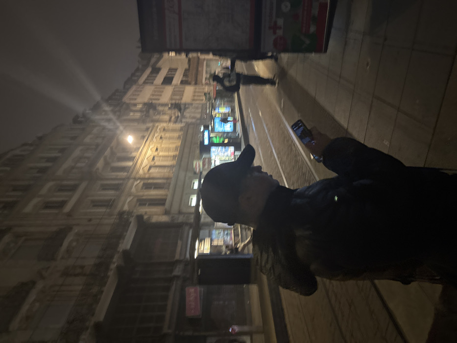 At night, a person wearing a black cap and jacket stands on a city sidewalk, engrossed in their phone. Tall, aged buildings line the street, illuminated by streetlights that cast a bright glow upwards. A bus stop sign is visible. Another person is visible in the distance.