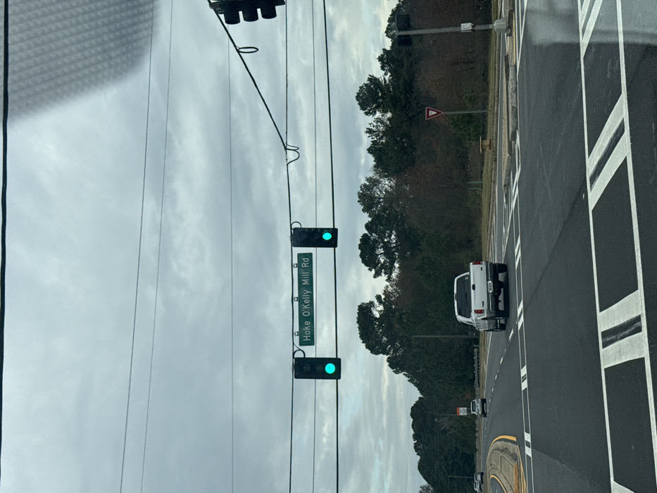 A street intersection is visible under an overcast sky. The street sign reads "Hoke O'Kelly Mill Rd" with a green traffic light above and below it. A white pickup truck is turning onto the street, and road markings indicate lanes. Trees line the background, along with a yield sign. Power lines are strung across the sky. A vehicle is partially visible in the lower right corner.
