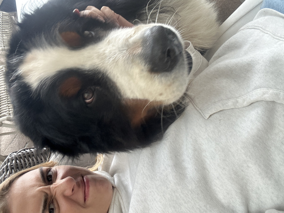 A close-up portrait, taken in Avandaro, Mexico, depicts a light-skinned female individual and a Bernese Mountain Dog
