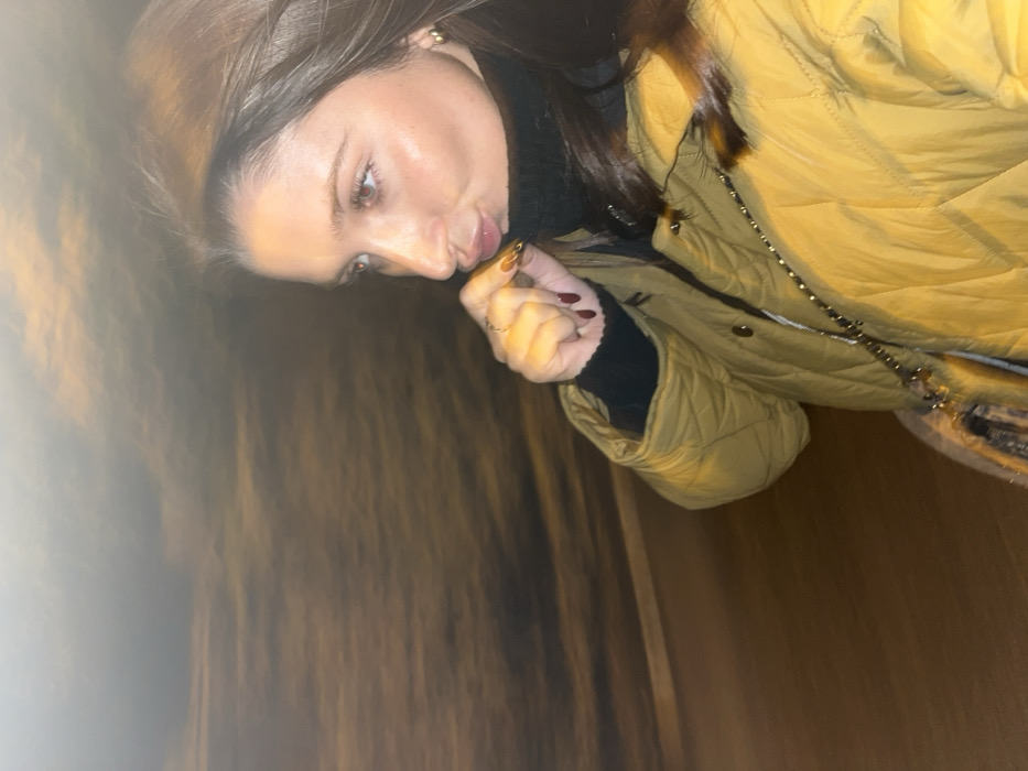 A young woman with brown hair and fair skin is visible in the image. She wears a black turtleneck and a quilted yellow jacket. Her nails are dark red. She is looking down with a playful expression, seemingly biting or holding something between her fingers. The background appears blurry, possibly suggesting movement or a dimly lit environment.