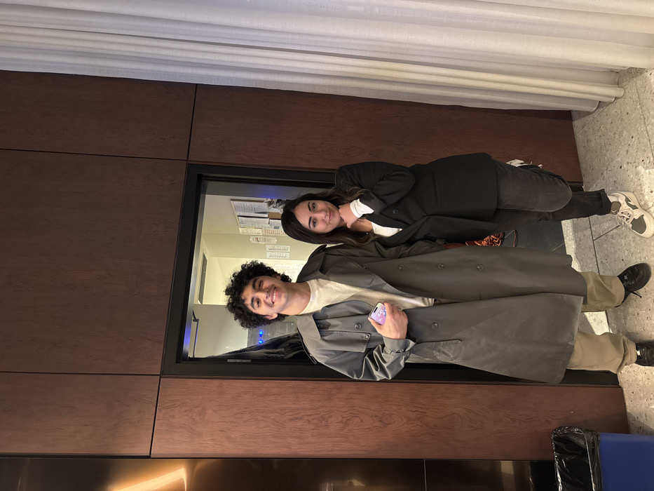 Two smiling individuals pose indoors in front of a glass-enclosed space. A woman in a black blazer and jeans leans against a man wearing a trench coat and khaki pants. The man holds a phone. The background features a brown paneled wall, a white curtain, and a patterned floor. A black trash can is visible in the lower right corner.