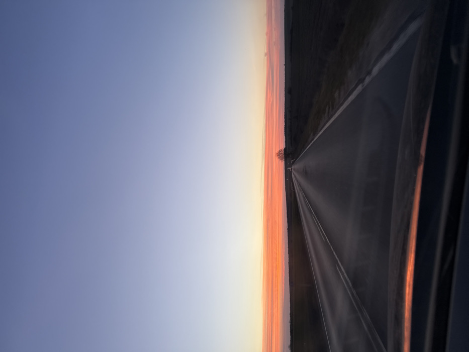 This image depicts a straight rural asphalt road at twilight, viewed from inside a vehicle, near Iarebichna, Bulgaria. The road features double solid white lines on the left and a single white shoulder line on the right, appearing somewhat reflective as it extends into the distance. The sky transitions from a clear, dark blue overhead to a prominent horizon band of intense orange, red, and pink horizontal clouds. Dark, flat, uncultivated fields border both sides of the road. In the far distance on the right, a solitary, bare tree stands silhouetted against the horizon. Faint white lights are discernible on the distant road. The dark dashboard and the lower section of the vehicle's windshield, exhibiting minor reflections, occupy the foreground. No individuals are present.