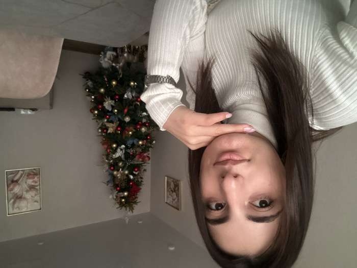 The image displays a young adult female in an indoor residential setting, positioned in the left foreground. She has dark brown, straight hair and is wearing a light-colored, ribbed turtleneck sweater. Her left hand, with light pink nail polish, is placed beneath her chin, and a silver-toned wristwatch is visible on her left wrist. She looks generally towards the viewer with a neutral expression. The background features light-colored walls. A decorated Christmas tree, adorned with red, gold, blue, and silver ornaments and illuminated by lights, stands to the right of the subject. Small, light-colored decorative figures are visible at the base of the tree. Two framed artworks hang on the wall: one on the left (details unclear) and another on the right depicting pink and white flowers. Partial views of light-colored upholstered furniture and a low cabinet are visible in the lower right quadrant. The specific geographic location, including the city of Tbilisi, Georgia, cannot be determined from the visual information present in the image.