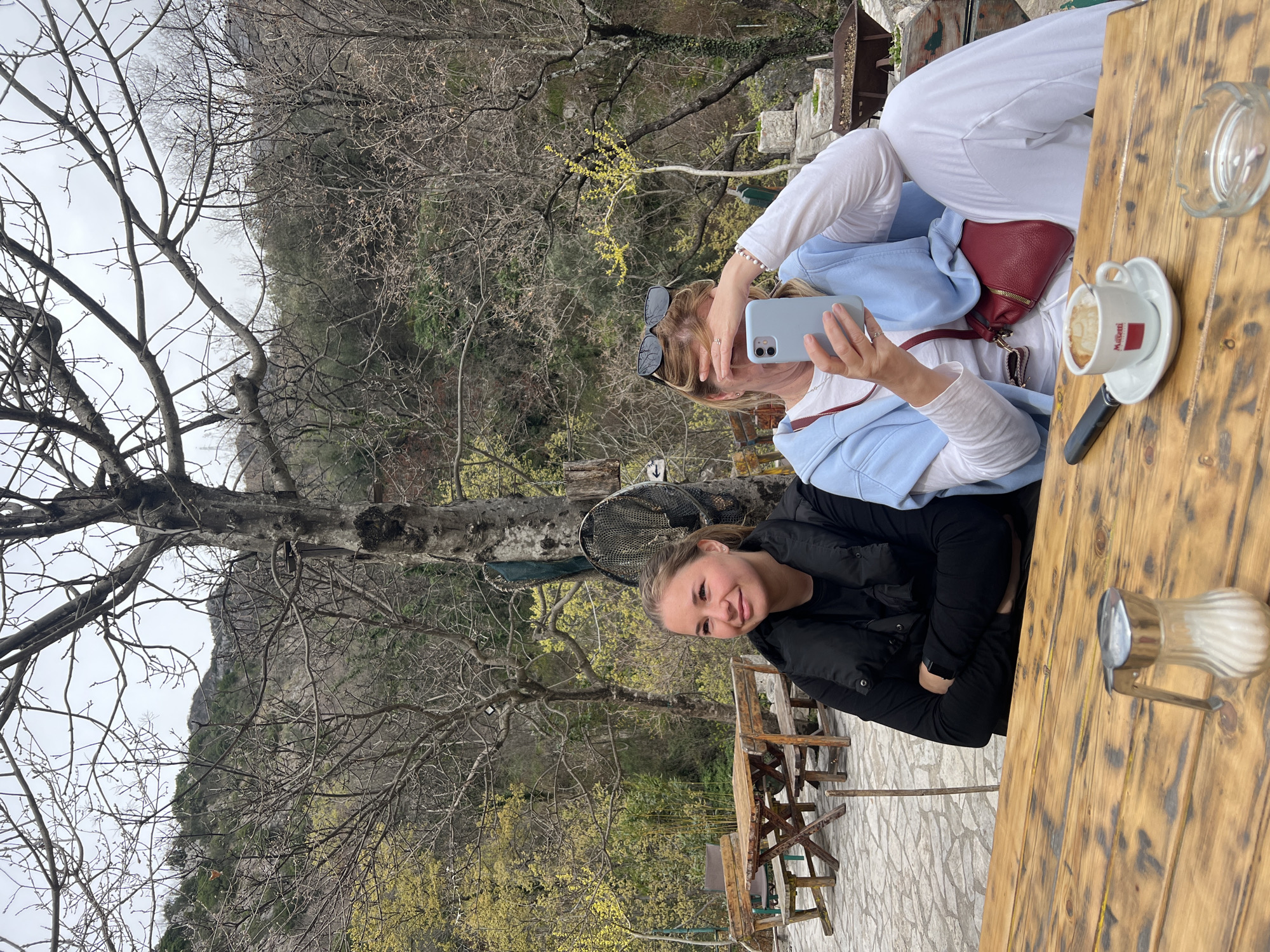 Two women are seated at a wooden table in an outdoor setting, possibly a cafe or restaurant. One woman is holding a smartphone up to her face, seemingly taking a photo. She is wearing a white top, light blue jacket, and white pants, with a small red purse. The other woman is wearing a black jacket and is smiling. A cup of coffee is on the table, along with a sugar dispenser and an ashtray. The background features a landscape with bare trees, a mountain, and greenery. The floor is tiled with stone. The location is unknown.