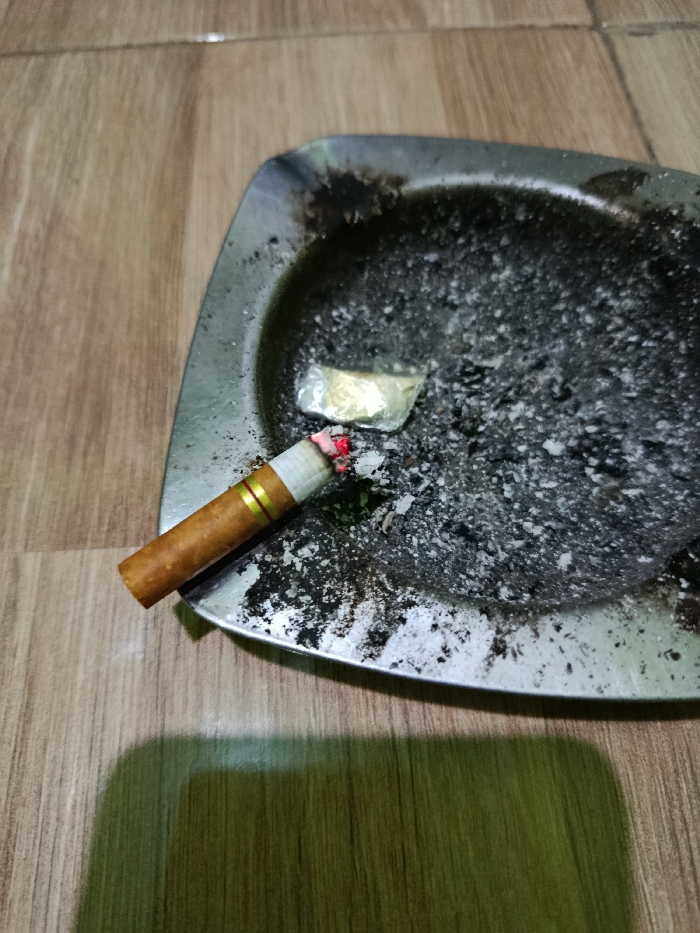 - "This image displays a used, square-shaped metal ashtray positioned on a light brown wooden or wood-effect tiled floor in Ketowan, Indonesia" by FM-Sgztu1, licensed under CC BY 4.0