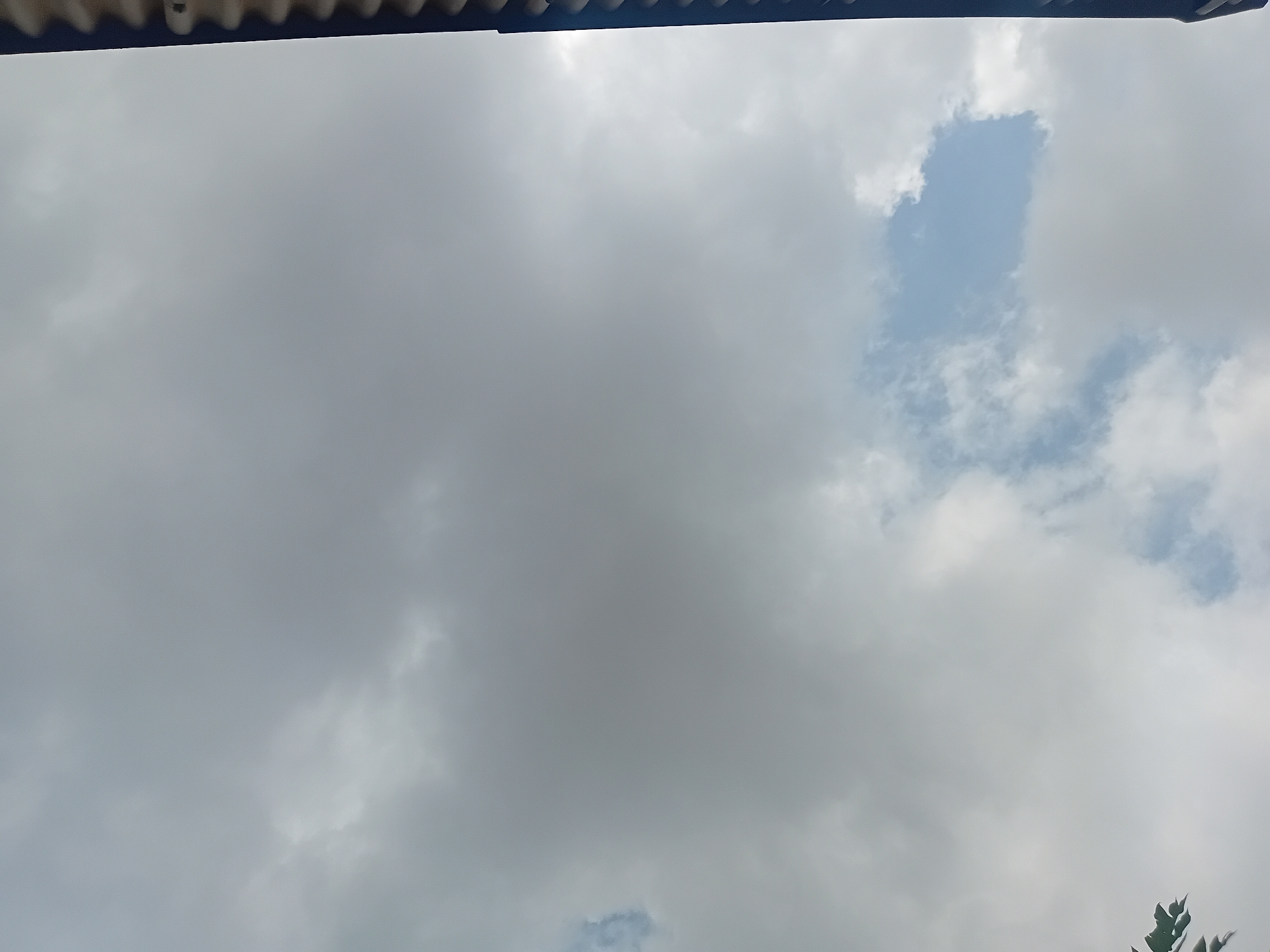 The image displays an overcast sky in the city of Unknown, Unknown. Predominantly, a large expanse of gray and white stratocumulus clouds fills the frame, with visible patches of lighter blue sky breaking through, particularly in the lower central and upper left quadrants. A dark, corrugated vertical structure is partially visible along the far right edge, suggesting a building or architectural element. In the lower-left corner, the dark green leaves of a plant or tree are partially visible. No people or active interactions are present. The overall lighting suggests daylight conditions, diffused by the cloud cover.