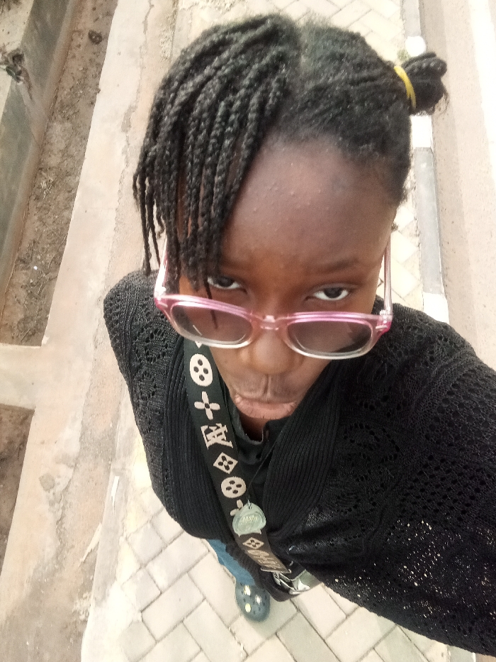 The image depicts an individual in Narayi, Nigeria, captured from a high-angle perspective. The subject has dark skin and dark braided hair; some braids fall forward, while the hair at the back is secured with a yellow elastic band. They are wearing pink-framed sunglasses, positioned low on the nose to expose their eyes, which are directed toward the camera. Attire consists of a black open-knit long-sleeved cardigan worn over a dark garment, blue jeans, and dark Crocs-style clogs. A black shoulder strap with white "LV" logos and stylized floral/geometric patterns, from which a silver-toned charm is suspended, crosses the chest. The background features light-colored rectangular paving stones on the ground and a raised concrete structure with visible dirt to the left. The individual's expression is direct and appears serious, with the mouth slightly pursed.