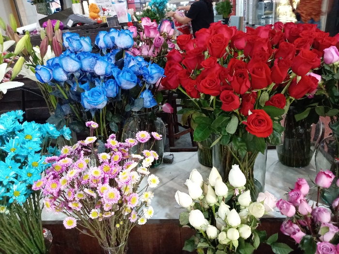 A vibrant array of flowers fills the frame. Blue roses, red roses, pink roses, white roses, and blue daisies are arranged in separate bunches within clear vases. Additional flower varieties with pink and yellow, as well as white petals and yellow centers are clustered together. A few people can be seen in the background of the shot.