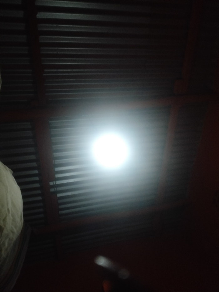 A ceiling is constructed of corrugated metal sheets supported by reddish-brown beams. A bright, diffused light source dominates the center, obscuring the details of the metal. To the left, a soft, white object, possibly fabric, is visible. The rest of the scene is shrouded in darkness, making it hard to identify. At the bottom, some blurry light spots can be seen.