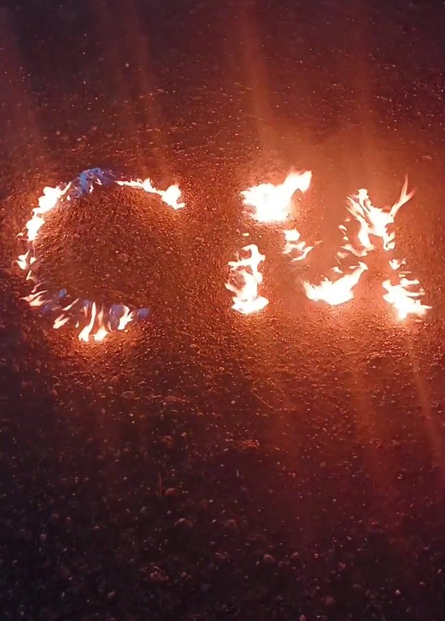 word "CIA" written on the ground in fire. The ground is covered in small rocks or gravel. There are some indistinct objects in the background. The scene is dark, with the fire illuminating the letters.