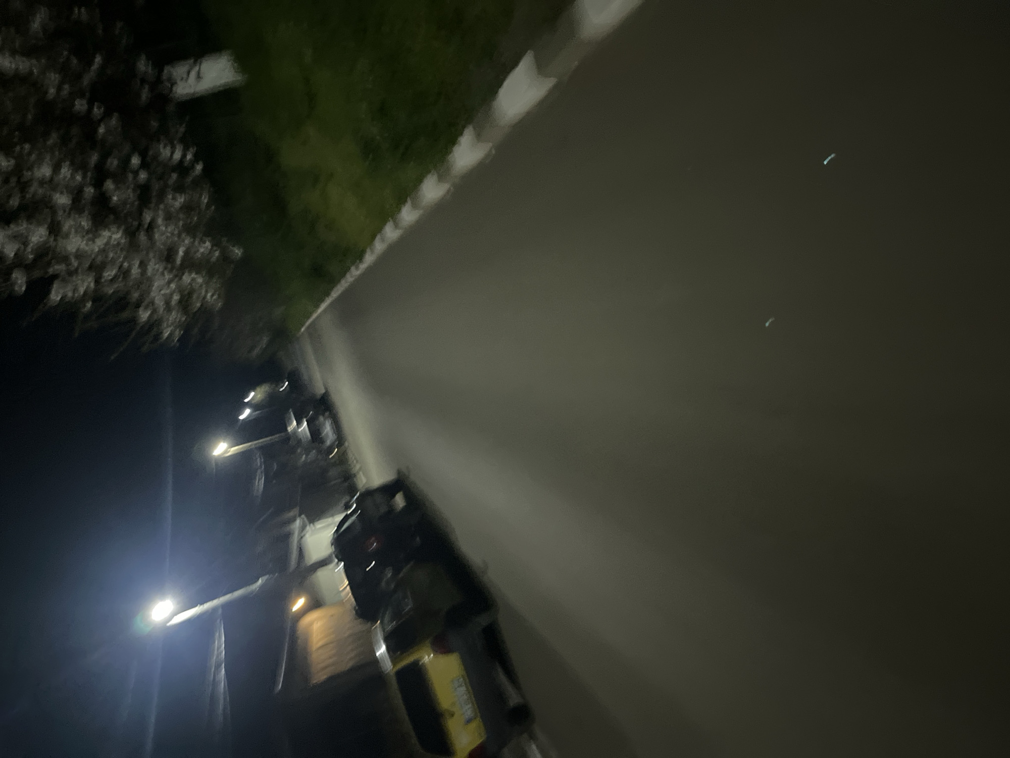 The image is a low-angle, poorly lit, and slightly blurry nighttime scene, likely taken with a handheld device