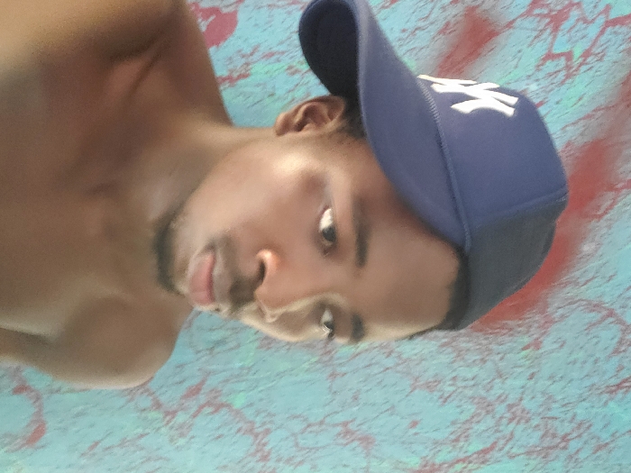 A young adult male, appearing shirtless, is depicted in a close-up against an abstractly painted wall. The subject has dark skin, short dark hair, and a goatee. He wears a dark blue baseball cap with a white "NY" logo, worn backward with the brim angled to the left. His head is turned slightly to his right, and his gaze is directed off-camera to the right. The wall behind him features a turquoise base with irregular red splatters or streaks. The location is an indoor setting within the city of Unknown, Unknown.