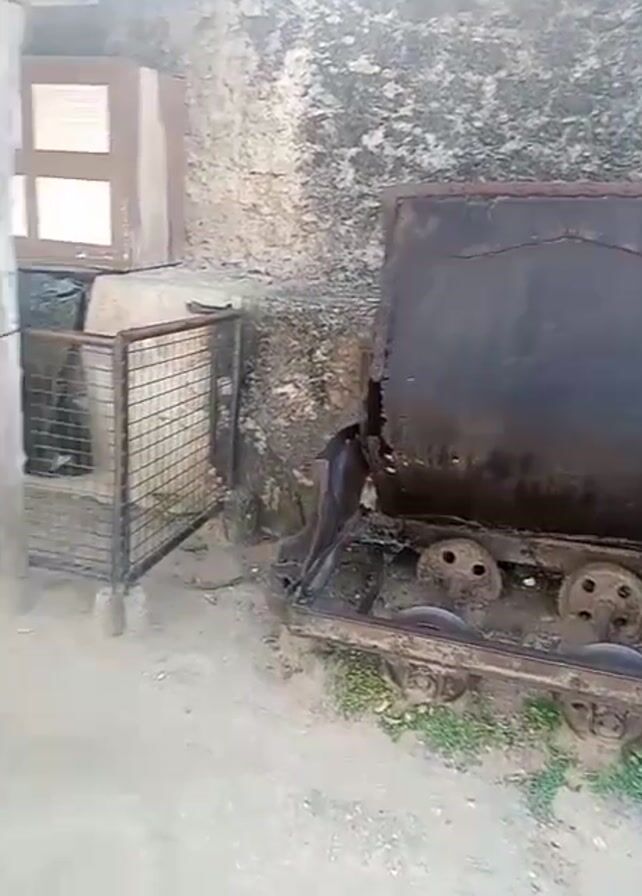 stationary rusty mine cart in front of a stone wall. To the right, there is a fenced-off area with a black tarp covering something. Behind the tarp, there is a display board with images and text. A whale skeleton is visible above the tarp.