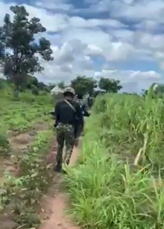 A group of soldiers are walking along a narrow path in a rural, overgrown field