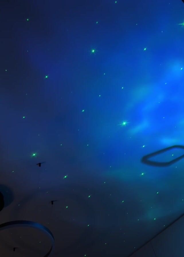 The camera looks up at a ceiling. There are bright green stars, and an aurora-like projection of blue, green, and purple lights. The ceiling appears white. There are two hanging lights with circular shades visible at the bottom left corner of the frame. The shadow of a light fixture appears on the right side of the frame.