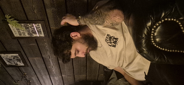 A man with a beard and tattoos sits in a black leather chair. He wears a tan T-shirt with the words "Never Look Back." The room has wood paneling and framed photographs on the wall, one with the words "Prohibition Ends At." The man appears to be relaxed, possibly resting, with his head leaning against the chair. The scene is dimly lit, creating a cozy or intimate atmosphere.