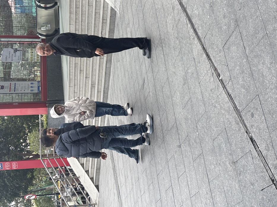 Three people stand on a gray tiled sidewalk. An older man wears black pants and a black jacket. A younger person with a white hoodie and jeans stands behind him. A man in a dark puffy jacket and jeans is closest to the camera. They appear to be near an entrance or station, with steps, signage, and metal railings visible. An escalator is nearby.