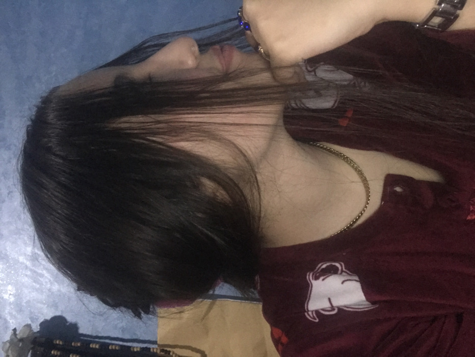 A person with long, dark hair is visible in the frame. They are wearing a maroon shirt with a cartoon graphic on it. A gold chain necklace is around their neck. A wrist with a metal watch is visible on their arm. The person is facing away from the camera, and their face is partially obscured by their hair. The background appears to be a light blue surface.