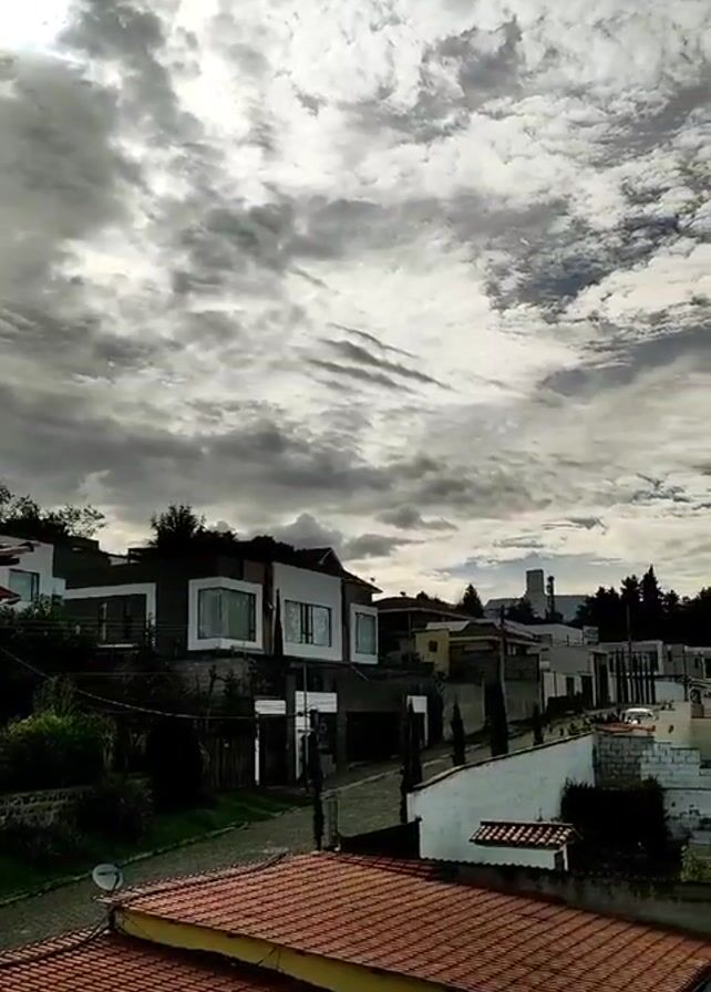 The camera captures a still, wide-angle shot of a suburban neighborhood under a dramatic sky. The sky is heavily overcast with a mixture of gray and white clouds, allowing patches of blue sky to peek through. The sun's light filters through the clouds, creating a diffused illumination over the scene. In the foreground, the red tile roofs of several houses are visible, suggesting a residential area. A road winds through the neighborhood, lined with houses of varying designs. Some houses are multi-story with modern architectural elements, including large windows and neutral color palettes. Other houses are smaller and more traditional in style, with white walls and darker roofs. Green trees and vegetation are interspersed among the houses, adding a touch of nature to the urban landscape. In the distance, a tall, slender tower is visible, possibly a telecommunications or water tower, providing a focal point on the horizon. The overall impression is that of a quiet, upscale neighborhood under a cloudy sky.