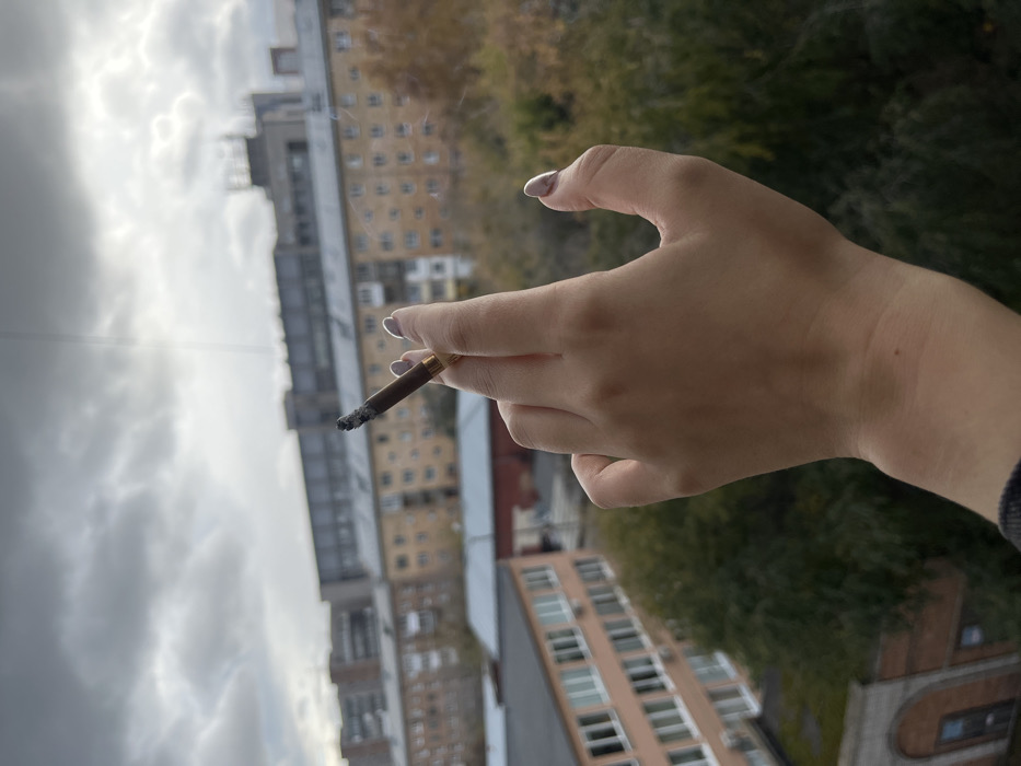 A human left hand with light-colored manicured fingernails is positioned in the foreground, holding a lit cigarette or cigarillo between the index and middle fingers