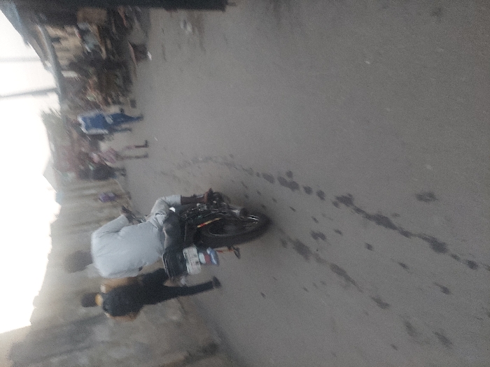 The scene captures two individuals alongside a motorcycle on what appears to be a city street. One person, dressed in a light-colored shirt and dark pants, is seen near the motorcycle. The other individual, wearing dark attire, is positioned in the lower part of the frame. The motorcycle is lying on its side. Streaks on the road's surface imply potential recent activity, possibly skidding or braking. Buildings are visible in the background.