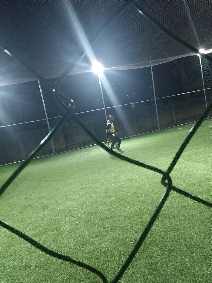 Artificial grass covers a fenced-in, lit soccer field at night. Two people are on the field, one wearing a yellow vest. The lighting is bright, and there is a concrete wall behind the field. The picture is taken through a green net.