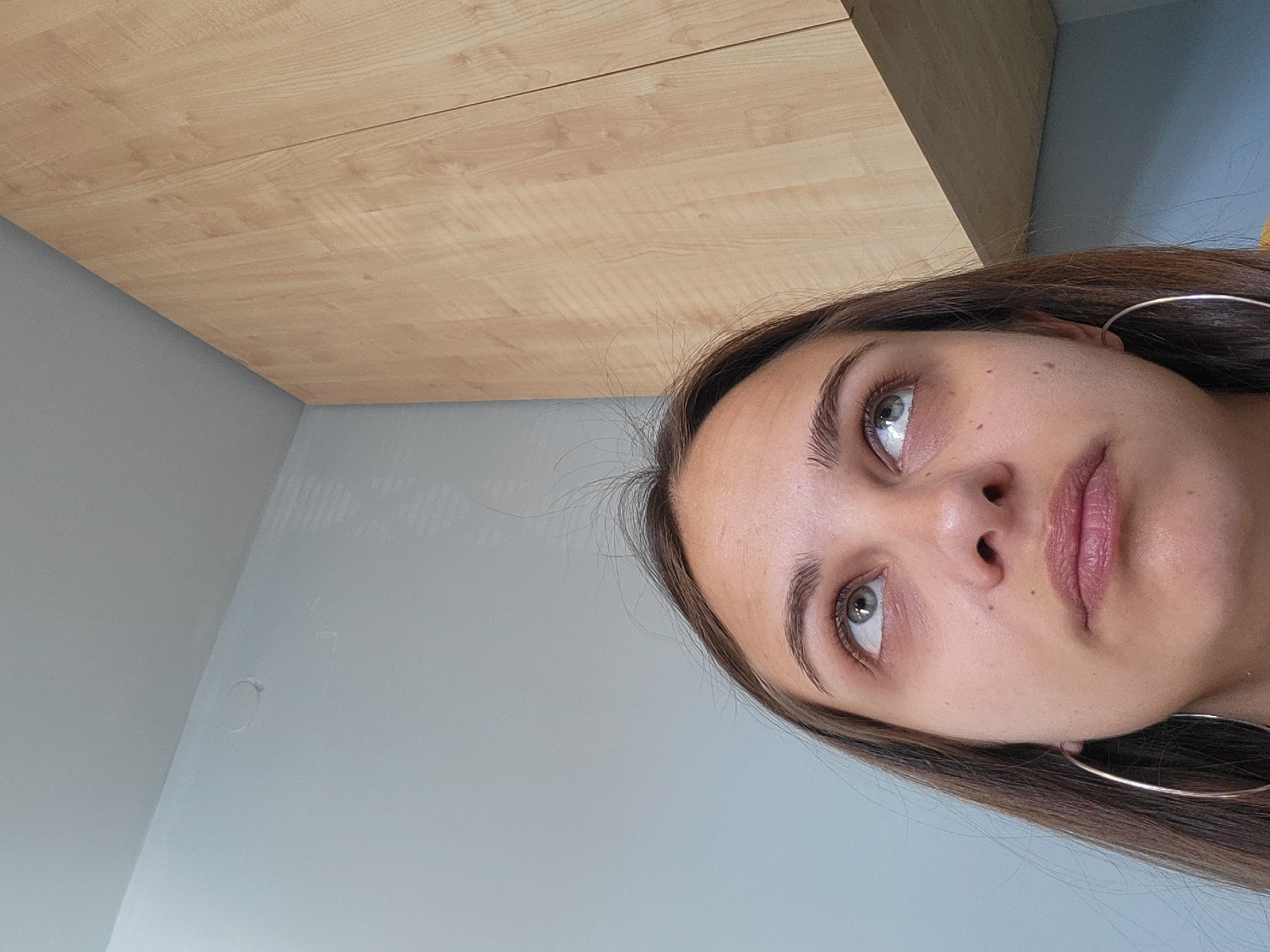 The image depicts an indoor scene in Kragujevac, Serbia. A young adult female occupies the lower half of the frame, visible from her mid-forehead to her upper chest. Her medium brown hair frames her face. Her eyes are green with noticeably dilated pupils, fixed upwards and towards the right side of the observer. Her lips are slightly parted. The subject has a light complexion with several small, dark freckles or moles visible on her left cheek. She is wearing large, silver-colored hoop earrings. The background consists of a plain, light grey or blue painted wall on the left, where a small, circular, light-colored fixture is visible near the upper left corner. To the right, a vertical section of a light natural wood grain cabinet or wall panel is present, forming an interior corner with the painted wall. The scene is evenly lit, indicating an interior environment.