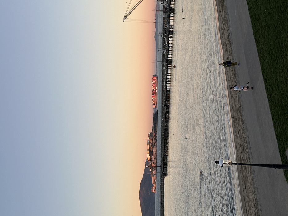 A coastal scene at sunset shows a long pier extending into the water with a cargo ship visible in the distance. A waterfront walkway runs parallel to the water with green grass on the other side. People are walking and running along the walkway. A lamppost stands near the foreground. A crane is visible at the end of the pier. The sky transitions from light blue to orange at the horizon.