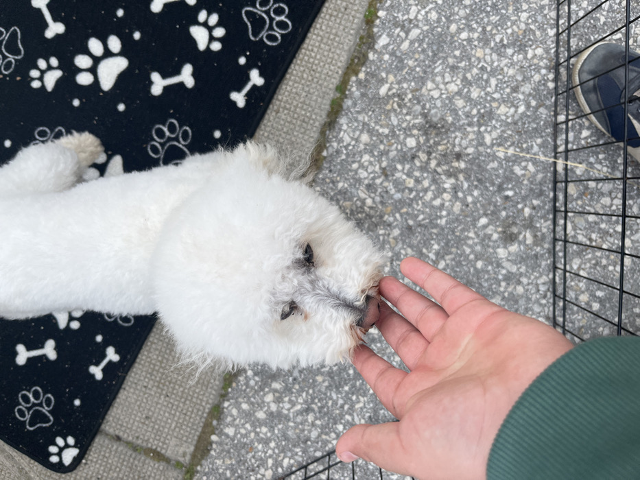 - "An overhead-angle photograph captures a close-up interaction between a white, fluffy canine and a human hand on an outdoor paved surface" by FM-HZnJH3, licensed under CC BY 4.0