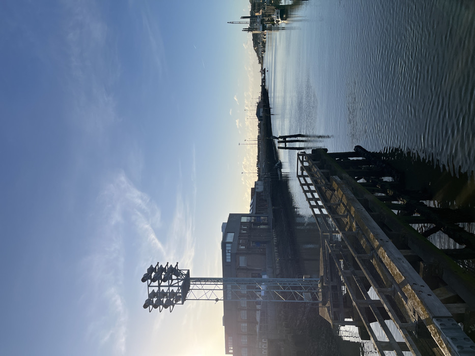 The image depicts a static, wide-angle view of the River Ouse within Newhaven Harbour, Newhaven, United Kingdom, under bright, clear conditions. The perspective is directed downriver, with the sun low in the sky on the far left. In the immediate foreground, an aged, weathered wooden pier extends diagonally from the lower-left of the frame towards the mid-right. This pier features a simple wooden railing along its length. Adjacent to the pier on the left bank stands a tall, grey metal lattice tower, topped with a cluster of twelve dark floodlights arranged in three rows of four. The left bank behind the pier and tower features a multi-story, dark-colored industrial building with numerous windows. The shoreline directly below the building appears dark and rugged. The central and right portions of the image are dominated by the calm, dark blue waters of the river, which exhibits subtle ripples and reflects the clear sky. Further downriver on the right bank, several small boats are moored, their white hulls visible against the darker water. In the distance, along the right bank and horizon, various industrial structures, including what appear to be cranes or drilling rigs, are discernible. Two dark, vertical wooden pilings protrude from the water near the center-right, with a dark, unidentifiable object, possibly a bird, perched on the taller one. The sky above is a clear, light blue with sparse, wispy white clouds. No human figures or overt actions are observed.