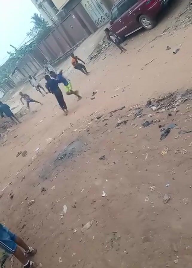several young people engaged in a game of football on a dirt road. The ground is uneven and littered with debris. A red SUV is parked on the side of the road, and a building is visible in the background. The quality of the video is grainy, and the focus is not sharp. The environment appears to be a lower-income residential area.