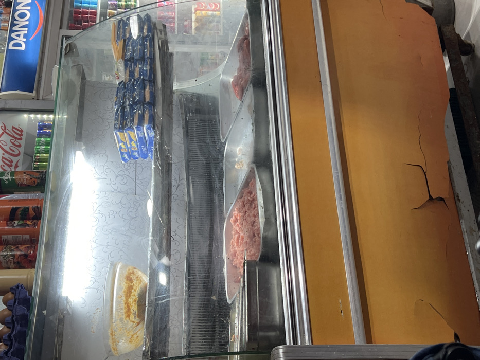 A refrigerated display case showcases various items. A 'DANONE' sign is visible alongside Coca-Cola beverages. Hanging pasta packages adorn the upper section of the cooler. Inside, trays hold different types of meat and a prepared food item in a clear container. The case's exterior features a distressed orange panel with cracked paint.